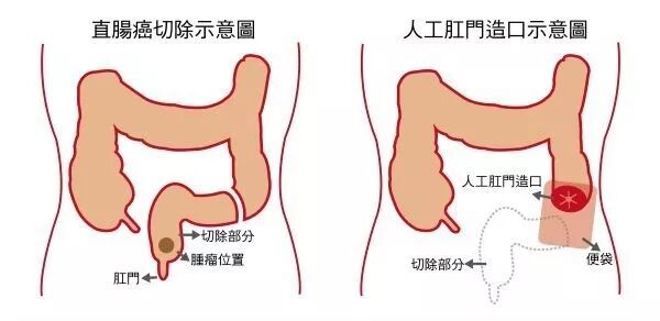 结肠造口:如果肛门和直肠必须切除,外科医生会将剩下的肠管缝合到腹部皮肤的开口处,这叫做结肠造口术。患者需要在开口处戴一个袋子来收集大便。如果直肠癌病灶离肛门较近,外科医生评估,在需要尽可能切除癌症的情况下无法保留肛门,那么直肠癌患者的结肠造口术可能是永久性的。